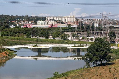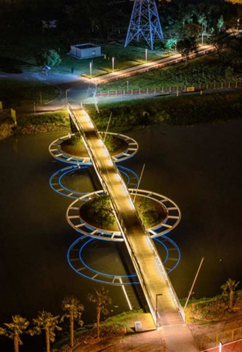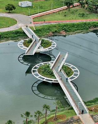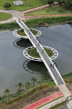 「フリードリヒ バイエル橋」は、サンパウロを流れる3つの川が合流する地点に建設された歩行者と自転車のための可動橋で、2013年に完成しました。この橋の最大の特徴は、川を航行する船の進行を妨げないように可動する部位が大きな円形をしていることです。加えて、橋の上に人がいても可動できることも特徴の1つになっています。全長約90mのこの橋は、3つの部分に分けられています。両岸から伸びた橋は、2個所の橋脚で支えられ、中央部分が水平に稼働して船を通します。橋脚はコンクリートで作られていて、その上に円形の庭のような部分が乗せられています。この地域で元々育っていた植物が植えられている円の外縁は鉄製で大きな空間が均等に開けられていて、橋を渡る人が川面の景色を見やすいようにと考えられています。浅い川や池を渡るために置かれる飛び石のようにも見える円形のこの部分は、熱帯地方に生える日本ではオオオニバスと呼ばれるビクトリア・アマゾニカの巨大な葉から発想を得た形です。円形の中心部分は船が通る時に、互いに違う方向に最大90度動くようになっています。電動のモーターを使っていますが、水平に動くことによって、可動のためのエネルギー消費は抑えられています。橋の床は半分木製で、歩行者が通行しやすいようになっています。もう半分は溝蓋などに使われるグレーチングのような格子状の物が使われていて、排水性を高めています。