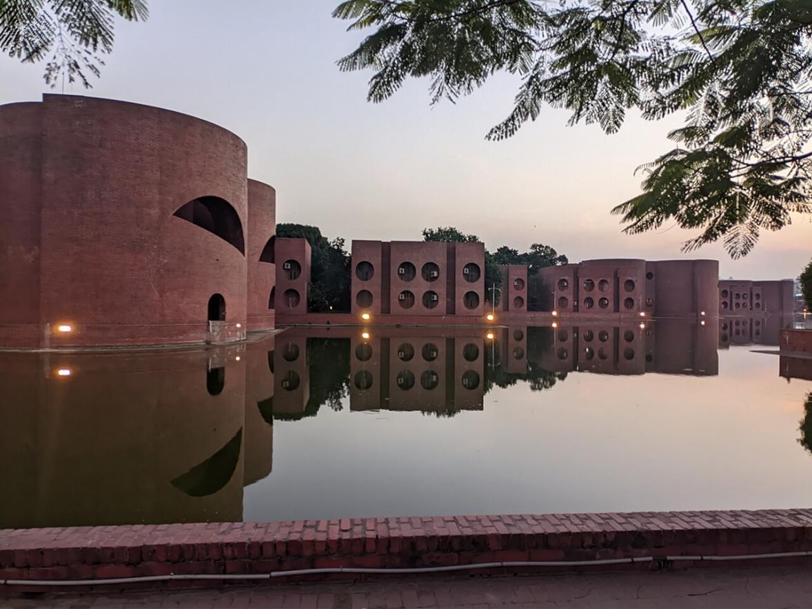 「バングラデシュ国会議事堂」は、南アジアの国、バングラデシュ人民共和国の首都であるダッカに建設されています。バングラデシュは独立国家となってから、半世紀をやっと過ぎた国で、世界で最も人口密度の高い国となっています。国の南側はインド洋の1部であるベンガル湾に面していますが、陸地はインドに囲まれています。インド亜大陸がイギリスの植民地だった時代からインドが独立した時に、宗教の違いからパキスタンに組み込まれ、インドを挟んで東に位置するため、東パキスタンと呼ばれていました。国土は平坦で、南アジアで最大規模の2つの川が流れています。西からはヒマラヤを源流とするガンジス川が流れ、北からはプラマプトラ川が流れています。2つの川はダッカの西で合流して1つの川になり、ベンガル湾の手前で大規模なデルタ地帯を作り出しています。ベンガルデルタは肥沃な土地がたくさんあり、農地にできる耕作可能地の割合は世界1となっています。しかし、洪水や、沿岸部では高潮の被害を受けることがしばしばあります。首都のダッカは7世紀頃には都市機能を持つ街でした。当時は仏教の影響が強かった街ですが、権力者が変わるたびにヒンドゥー教やイスラム教が支配的になることがありました。加えて、多様な民族の人々が暮らすことで様々な文化が入り交じり、独特の文化を育んでいます。