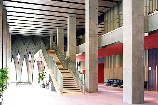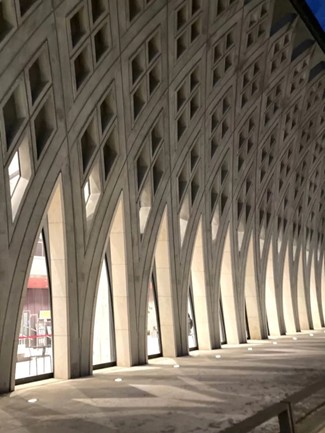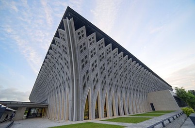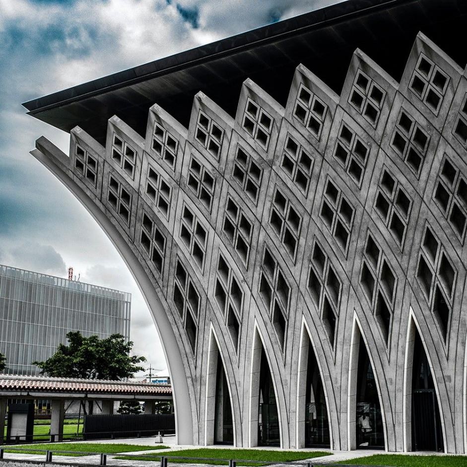 2003年に完成した「国立劇場おきなわ」は、全国にある国立劇場の中で5番目に作られました。地上3階、地下1階で大小2つの劇場を備えています。比較的大きく見える建物ですが、外観によってとても優美な印象があります。まるで、幾何学模様に編まれた中世ヨーロッパの貴婦人のドレスに付けられているレースの立ち襟のようであり、また、切り込ガラスの模様にも見える趣のある建物です。連続したひし形の幾何学模様は、沖縄の伝統的な建物の設備から着想を得ています。「ニチブ」と呼ばれる伝統的な外壁の作りに見られる模様で、割った竹を斜めの格子状に組んで作られます。現場でコンクリートを型枠に流して、上下の長さが12m、幅が2m弱の大きさで、最大重量が30トンもあるパーツを作り、それを組み立てていきました。この外壁は上に行くに従って外側に反るように作られています。この形も古い建築物から発想を得ています。沖縄は古くから現在に至るまで、夏の時期には熱帯性の暴風雨に晒されてきました。「雨端(あまじ、あまはじ)」と呼んばれる、大量の雨から屋内を護るために、軒先に柱を立てて軒を大きく張り出して作られた所を参考にしています。外壁の下部にはアクセントとして白い部分がありますが、これには沖縄で古くから使われている「琉球石灰岩」が使用されています。この石材は、館内の床にも使われていて、デザインと共に素材も地元の物が使われています。