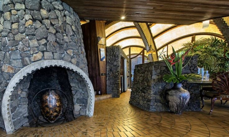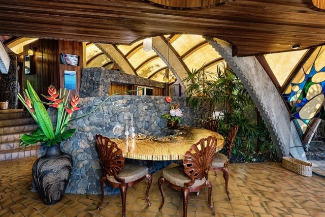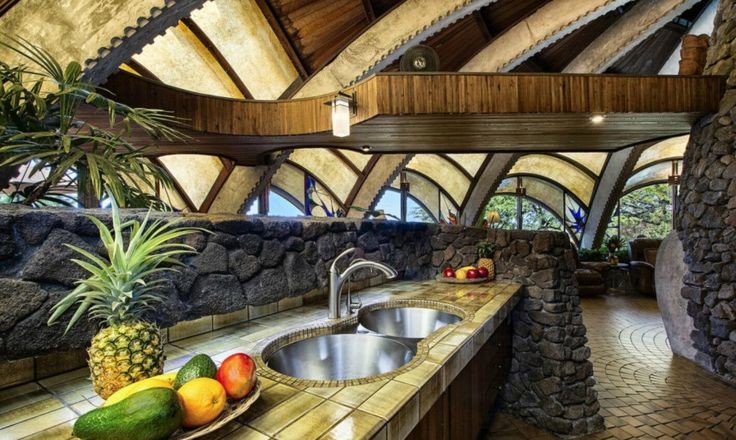 「オニオンハウス」は設計者が自ら建設に携わり、1963年に完成しました。この建物の建設には様々な逸話がありますが、第1に独特な形の建物なので、建設業者が見つからなかったことが上げられます。その為、設計者が自分で建設することを決心して、家が出来上がるまでの期間、ハワイ島に住むことにしました。1963年に完成した「オニオンハウス」の外観の見た目は文字通りタマネギに似ていますが、横から見た印象は、熱帯のサンゴ礁に生息する大きな二枚貝のシャコ貝にも見えます。大小2つの建物で構成された家で、プールの脇に建てられています。1番の特徴は屋根の形で、円形の家の中心から放射状に開いた複数のアーチで作られています。屋根の中心には尖塔が取り付けられていて、中心に近い部分は欧州赤松の板で覆われています。外壁の無い特徴的な構造で、屋根の最下部のアーチが最大になっているところからは、窓のようになった29枚のステンドグラスやスクリーンが取り付けられていて、家の内外を隔てられるようになっています。屋根の大部分は半透明のガラス繊維が使われていて、日中は乳白色に見えて屋内に柔らかな日光を取り入れています。夜間になると、室内の明かりが半透明の屋根を通して建物が浮かび上がるように見えます。屋根の骨組みは、曲線を描き、形が自由に作れることから、コンクリートで作られています。家の中心部に造られた暖炉や、内壁の1部、敷地をかさ上げしている石垣に使われている石は、溶岩が使用されていて、全て建設地の近郊で採取されています。