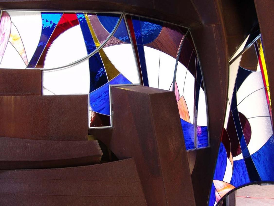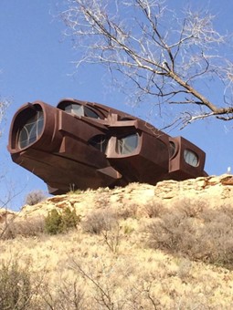別の星、若しくは違う次元の4本足の生き物のような形をした、鋼鉄で作られた家が「ロバート・ブルーノのスチール ハウス」です。ランサムキャニオン湖を見下ろすように建てられたこの家は、名前の通り、全て廃材や端材の鋼鉄で作られた家で、100トン以上の材料が使われています。鋼鉄は、ロバート・ブルーノが彫刻の素材として好んで使っていた材料で、コルテン鋼と呼ばれる耐候性に優れた素材です。コルテン鋼は素材の劣化を遅らせる為に、あらかじめ特殊な錆を浮かせているので、赤錆色をしています。この色合いなので、尚更動物のように見えます。彼の彫刻作品と同じような形をしているので、直線的な部分はほとんど無く、内部も四角い部屋にはなっていません。いくつかの窓も楕円や半円に近い形で、ステンドグラスのようにガラスが分割して入れてあります。部屋は明確に壁で仕切られていませんが、部屋の部分には透明のガラスが使われ、階段などの横には色ガラスが使用されています。1973年に着手され、ロバート・ブルーノが1人で溶接作業をしながら作っていました。30年以上かけて手直しをしながら作業を続け、亡くなった時には外観はほぼ出来上がっていましたが、内装は未完成のままでした。また、図書室や水槽も設置する予定だったということでした。