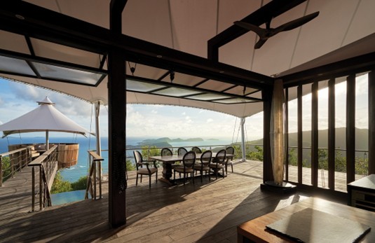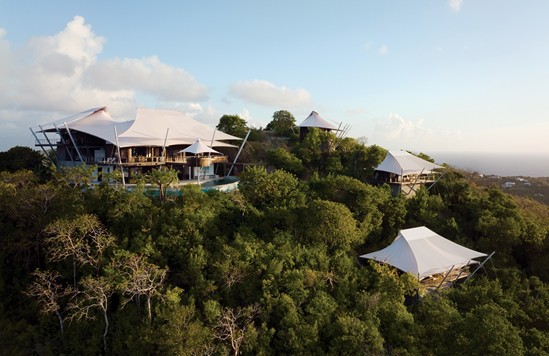 「ベキアのセイル ハウス」は住居と宿泊施設を備えていて、2020年に完成しました。丘の樹々を波になぞらえれば、本当に小型の帆船に見える複数の建物で構成されています。樹木の緑と屋根の白い帆布、眼下に広がるカリブ海の海の色は絵画のような印象があります。古くから伝わるカリブ海の暮らしを尊重した上で、島に建物を建設する難しさと自然環境に負担をかけないと言う問題を解決した結果が、このような美しい建物群になりました。建設については、あらかじめいくつかの部品を違う場所で作り、それを建設地で組み立てる工法が採用されました。設計者は島の丘に建設する困難をこの方法で解決しました。帆に見える屋根は様々な役割があります。まず、強い日差しを遮って過ごしやすい屋外空間を作り上げる事が挙げられます。次に、いくつかの大きな屋根は2重になっていて、暑い空気を上に逃がす風の通り道を作っています。また、帆布から伝った雨水は帆を支えているステンレス鋼の柱に注ぎこまれ、コンクリートの基礎部分に造られた貯水槽に水が貯められるようになっています。持続可能性を掲げていることもあって、使用された建材はリサイクル材が多く、生育速度の速い植物や廃棄される植物の部分も使われています。床などに使用されている木材は桟橋に使われていた木の再利用です。壁にはヤシの木の繊維やココナッツの殻を砕いたものが使用されています。