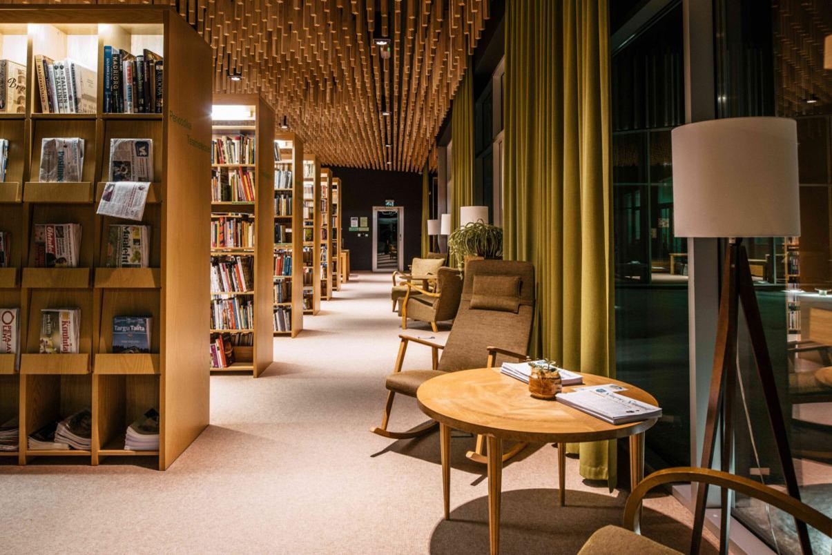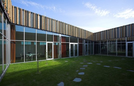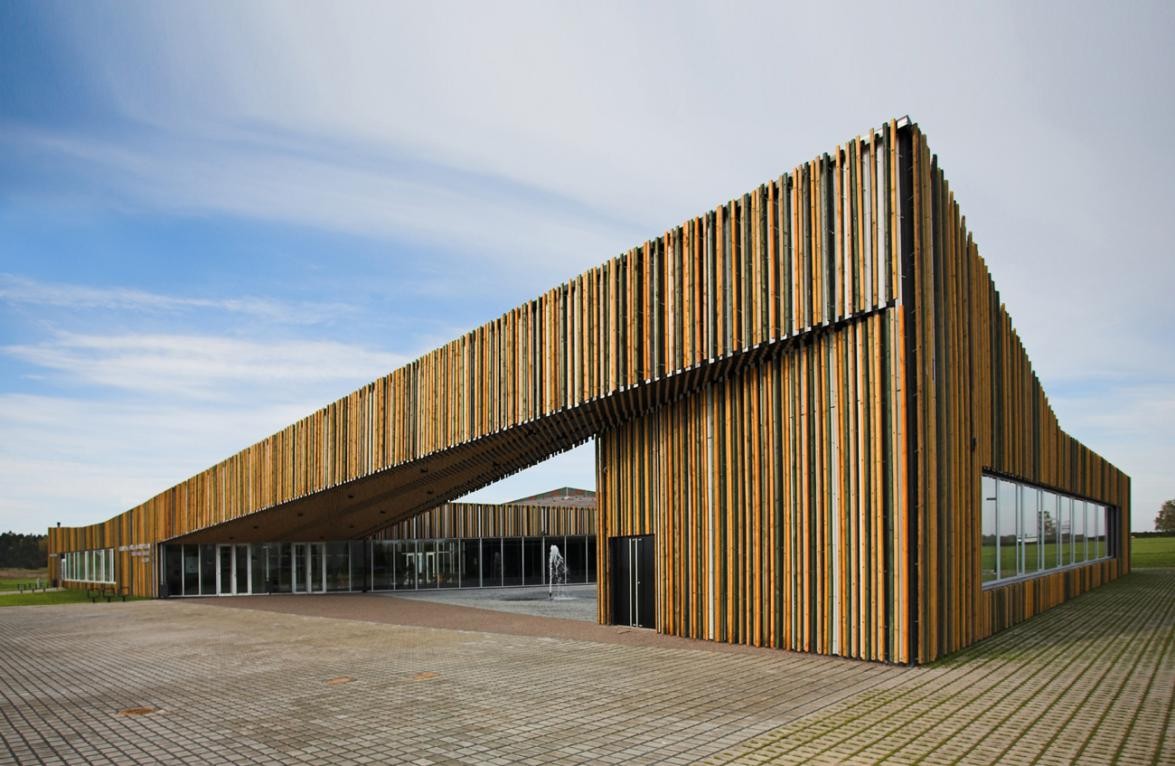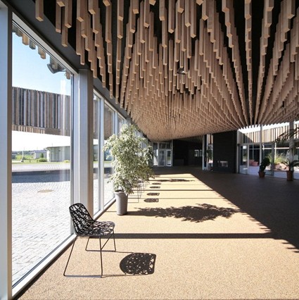 「ソメル コミュニティセンター」は、2010年に完成した地域住民のための様々な機能を備えた施設です。平屋で3つの中庭を内包したとても明るい作りになっています。屋根は横から見ると平らではなく、高低差があって、屋内の天井もそれに倣って高さが違います。一見すると木造建築のように見えますが、建物はコンクリートで作られています。無機質なコンクリートを覆うように、穏やかな色合いの細い木材が取り付けられています。これは、周囲にある牧草地や草原に見立ててデザインされた結果で、屋根の高低差は風になびく野原の草が表現されています。また、屋内の天井にも、同様の木材が垂れ下がるように不規則な長さで取り付けられています。3つの中庭の内、1番広い玄関前の前庭にも細い屋根が続いていて、半分中庭のような印象があります。そこでは、地域の行事や催し物が行われるようになっています。次に、カフェのそばにある中庭は、木の床になっています。玄関口から1番遠い中庭には芝生が敷き詰められていて、図書室が取り囲んでいます。いずれの中庭も周囲がガラス窓になっていて、明るい自然光を室内に届けられるようになっています。インテリアも、自然の温もりを感じられる素材が多用されていて、椅子などの家具も伝統的な物が使われ、小さな地域社会の家庭的な雰囲気が伝わってきます。