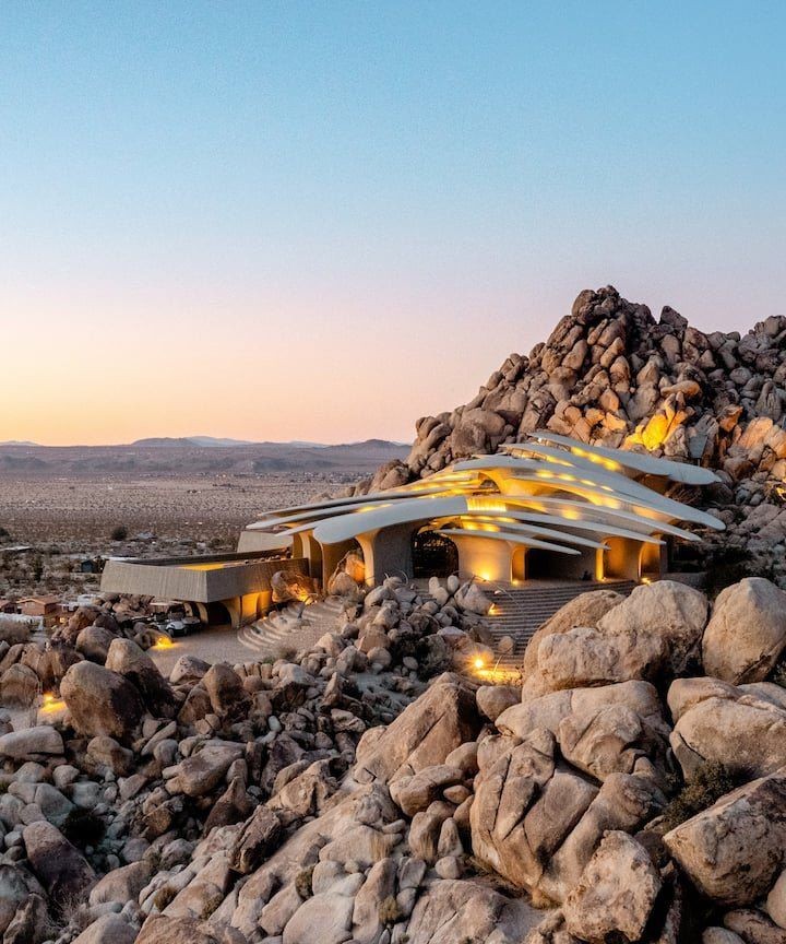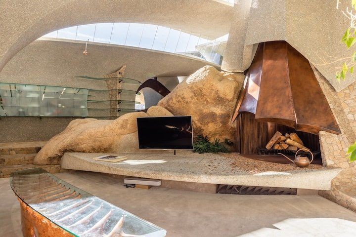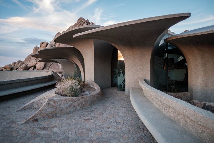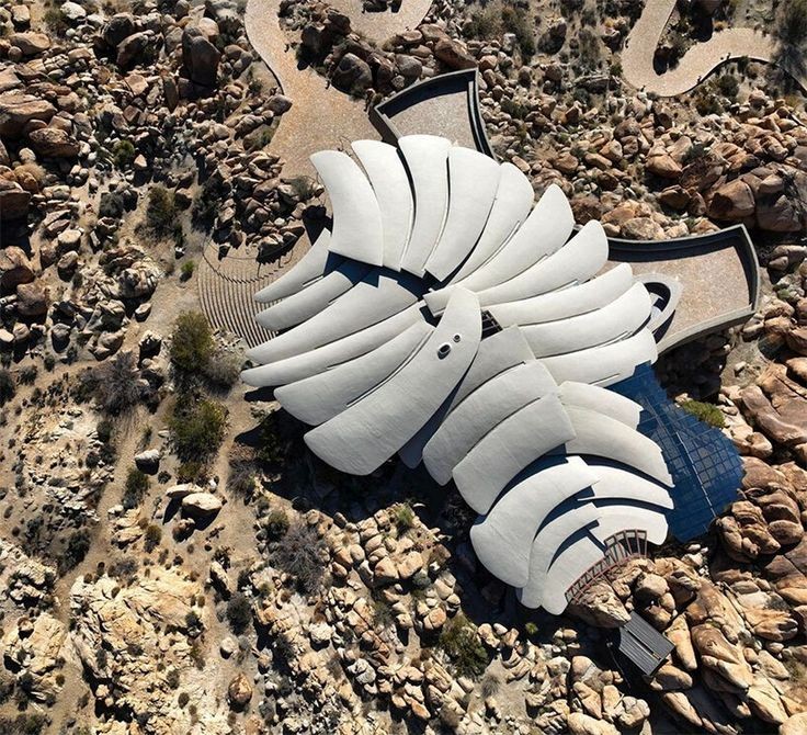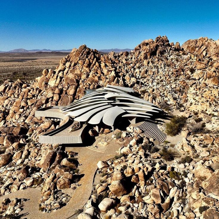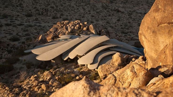 「ケロッグ・ドゥーリトル邸」は、1993年に建物そのものの基本的な部分が完成しました。その外観は様々なものに例えられています。砂漠に埋もれた古代生物の化石とか、宇宙から飛来した未知の文明の宇宙船など、見た人によって印象が変わっています。「ケロッグ・ドゥーリトル邸」は、ジョシュアツリー国立公園のすぐ北側にある岩山をそのまま利用して建設されました。岩山の地形にあまり手を入れないで作られているので、いくつもの岩がそのままの状態で屋内の装飾となっています。基本の柱や屋根の構造は、コンクリートが使用されています。合計で26本の柱はこの建物の重要な要素です。それぞれの柱は地面からおよそ2mの深さに撃ち込まれています。地面から立ち上がった柱は、そのまま花開くように滑らかな曲線を描いて屋根として広がっています。細長く不規則な形の形状で、それぞれがわずかづつ重なり合っています。その形は、香木で作られた扇の要を外してすこし分解させたような形にも見えます。屋根には少しづつ隙間があって、その隙間にはガラスがはめ込まれています。屋根と天井が一体化していることで、日中は照明を必要としません。屋内は曲線を多用していて、設計者の得意とする有機建築の様相を見せています。床は滑らかな石畳で、広大な敷地に露頭している巨岩と同じく、不規則で自然な形に見える花崗岩で敷き詰められています。その石畳は、そのまま立ち上がって壁の1部にもなっています。