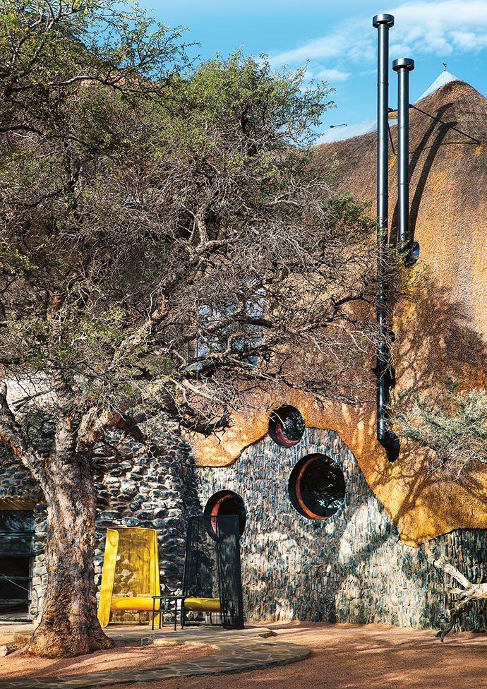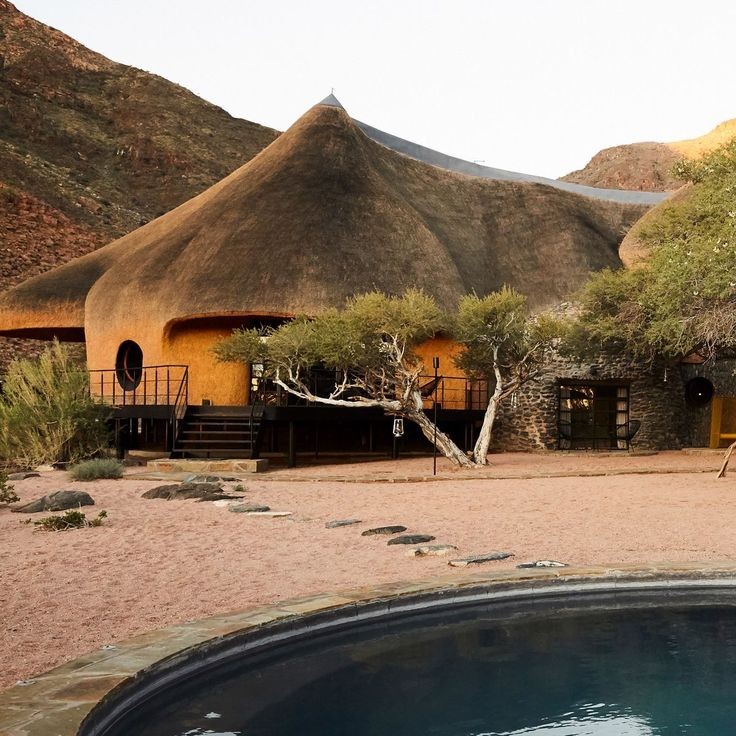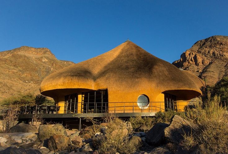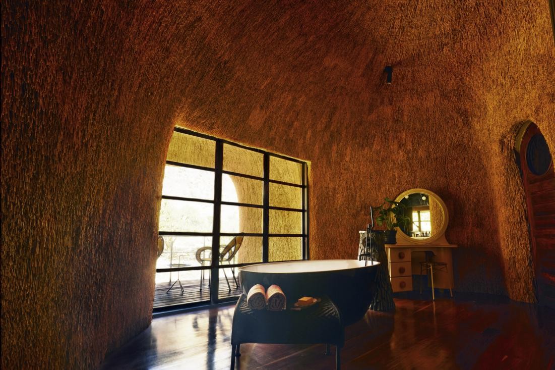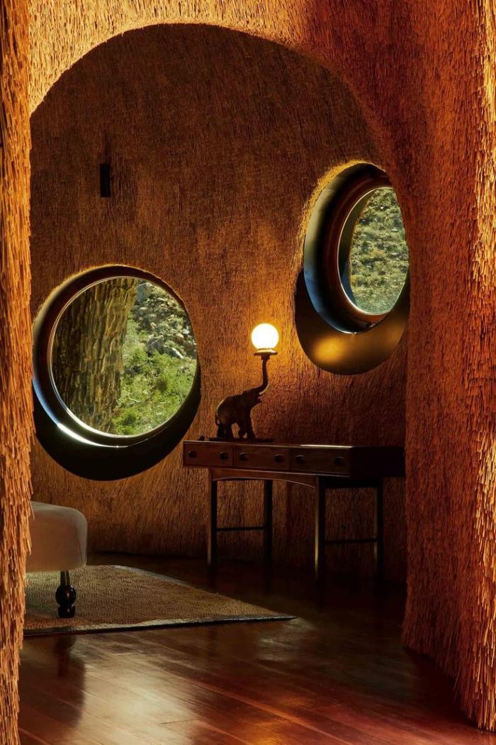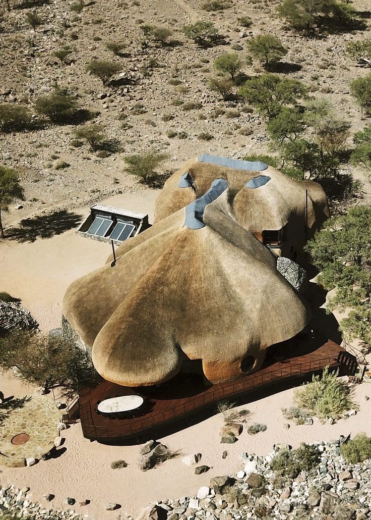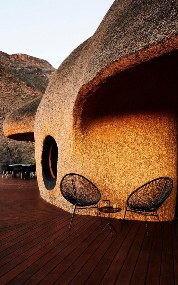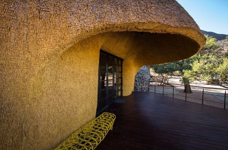 計画から出来上がるまでにおよそ8年の歳月が必要だった「ザ ネスト」は、2018年に完成しました。最寄りの町まで100km以上あり、1番近い都市までは500kmも離れている所が建設地です。近辺には砂とわずかな植物しかないところで建物を作る事は至難の業でした。通常の建物を作ろうとしたら、建設資材は500km以上の距離を輸送しなくてはなりませんでした。加えて、依頼者も設計者も建設地の風景を乱したくなかったことも、建設用の資材のほとんどを近隣で入手できるものにした理由となっています。3階建てでかなり大型の建物ですが、大きな屋根が茅葺になっていることで、周囲の赤い砂と同化して大きさを感じさせません。円形を基本とした形で、中心から不規則な放射状に伸びた屋根はふわふわした印象があります。このような形状になったのは、この地域にだけ生息しているハタオリドリの1種の大きな巣から発想を得ています。枯草を編んで木の枝にぶら下がるように作られた大きな巣では、小さな鳥たちが集団で生活し、雛を育てています。壁は内側も外側も屋根と同じく茅葺になっていて、まるで繭の中にいるようだと設計者は語っています。建物の基本は鉄筋が使用されていて、下部の壁には建設地の周辺で採取された石と川砂でレンガが作られて、その上に近隣で採石された花崗岩が貼り付けられています。屋内の床や家具などは国内産の木材が使用されています。