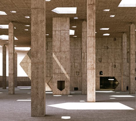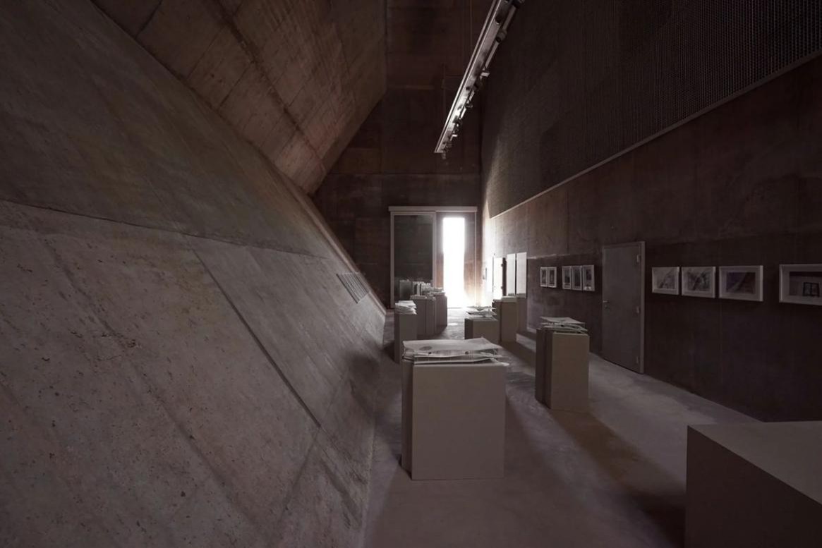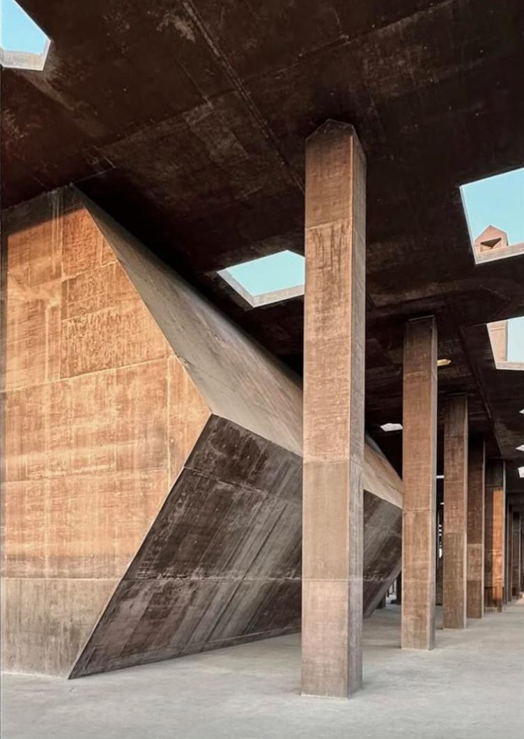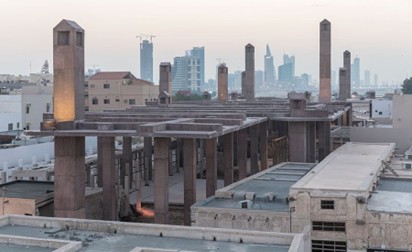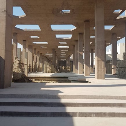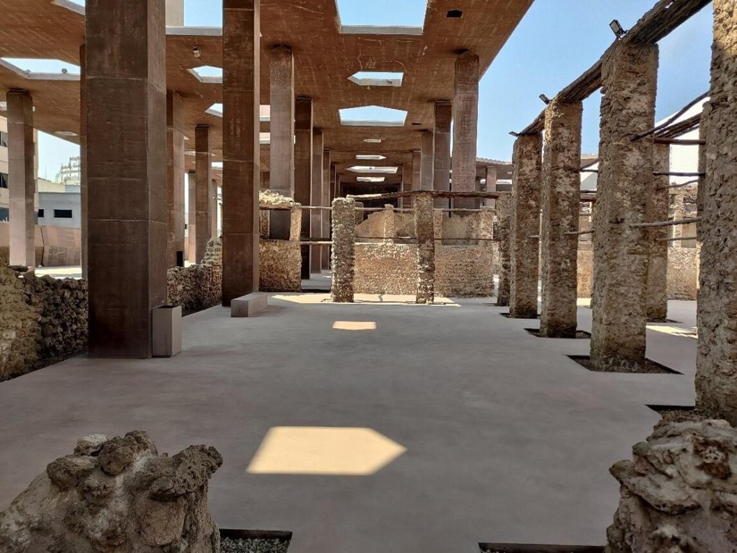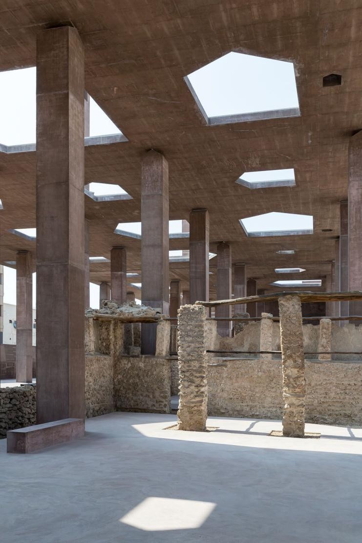 「真珠採りの道博物館と入り口」は、2019年に完成した「真珠採りの道」を覆う天蓋とその歴史を伝える博物館で成り立っています。100年以上前の産業に使われていた複数の建物と、それらを繋いでいた石畳の道は潮風に晒されて風化して行きました。加えて強力な日光がそれに追い打ちをかけています。これらの遺跡を守るために建設されたのが「真珠採りの道博物館と入り口」です。遺跡と同じような色合いの赤系とグレー系の色をしたコンクリートで作られていて、全て、現場で製造された打ち放しのコンクリートで、型枠の後はそのまま残されています。この地では現場打ちのコンクリートで建設する方法が行われていなかったため、その技術もこの建設時に伝えられました。数多くの柱が遺物を傷つけないように建てられていて、そのうちのいくつかは「風の搭」と呼ばれる中が空洞の柱になっています。風の搭は屋根のある煙突のような形で、空気の流れを作り出すために設置されていて、敷地内の気温を下げる効果があります。10mの高さに作られた平たい屋根のような天蓋には、家の形を簡略化したような大小の5角形の穴が開けられていて、自然光を提供していて、どこかを指し示す矢印のような光を床に映し出しています。博物館の建物は比較的小さく、天蓋に開けられた穴と同じような形を、90度横に倒した形状になっていて、独特な印象を与えています。